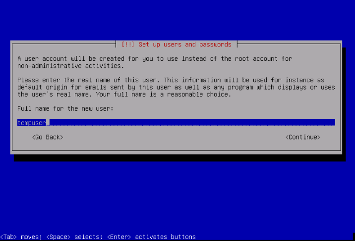 Skip creating a root password - we'll give the tempuser account below root access